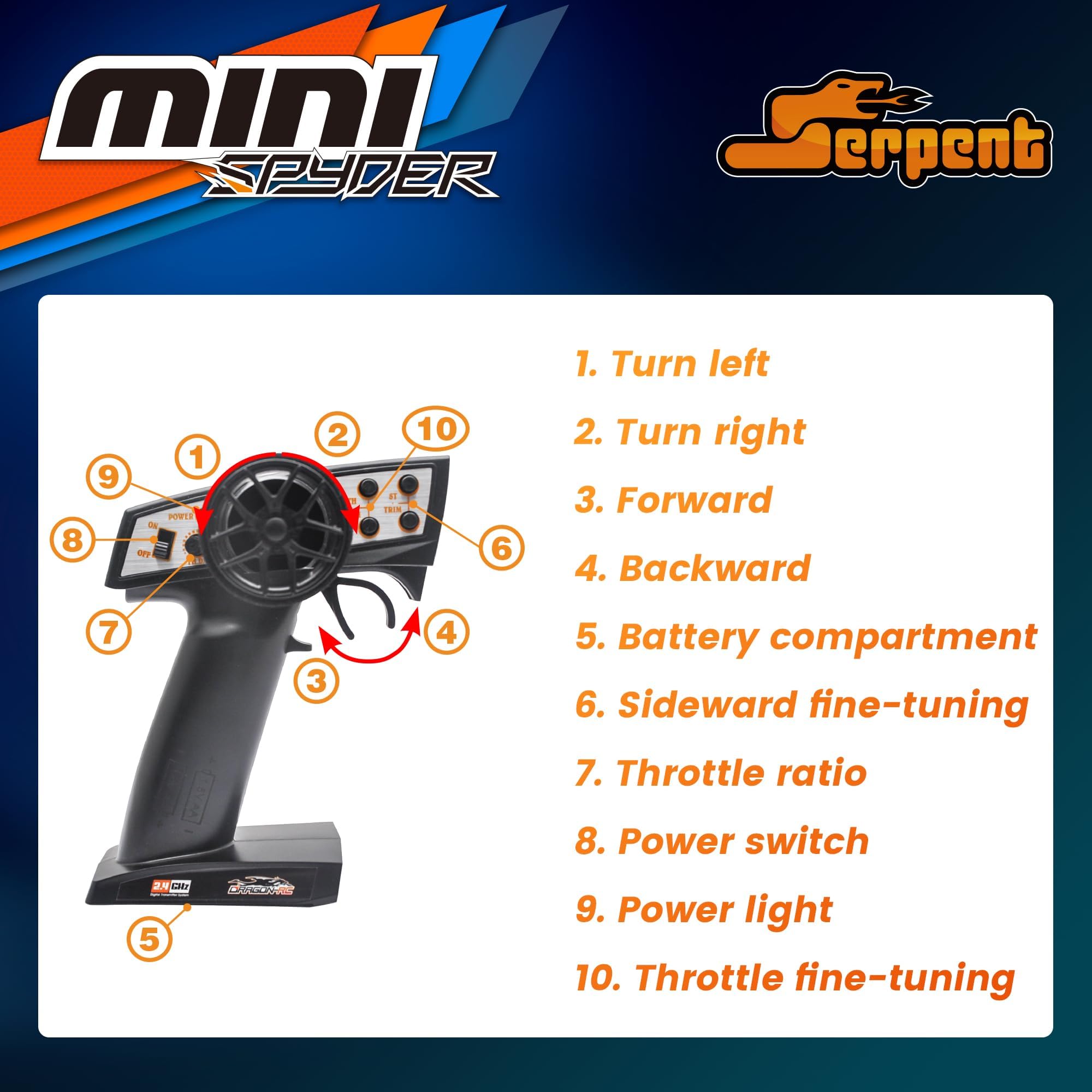 - Tecnologia Avanzata e Design Robusto-Il Serpent Mini Spyder RTR 1/24 è un veicolo radiocomandato fuoristrada in plastica superelastica, progettato per assorbire urti intensi. Dotato di ruote ad alta aderenza e tecnologia di ultima generazione, offre prestazioni impeccabili su qualsiasi terreno.